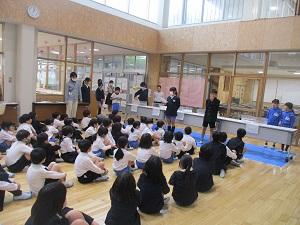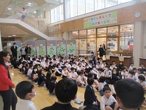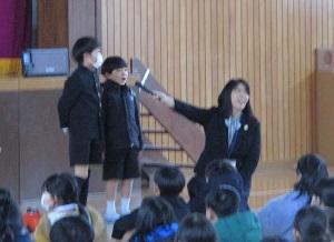まずは校長先生のお話です。毎月行っている詩の暗唱の発表ですが、低学年の詩「わたしと小鳥とすずと」を2年生に、高学年の詩「シグナルとシグナレス」をいつも暗唱を楽しみにしてくれている1・2年生の兄弟に発表してもらいました。