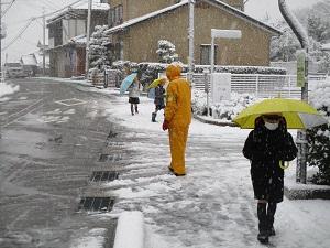 22日、いよいよ冬将軍がやってきました。大人は雪と聞くと困ってしまいますが、子供達は雪が降るとなんだか嬉しいようです。しかしながら、雪や雨の日はどうしても車での送迎が多く、駐車場の出入口がとても危ないです。また、校門前には信号のない横断歩道もあります。こんな雪の朝でも、ボランティアさんのおかげで、子供達は安心して登校できます。本当にありがとうございます。