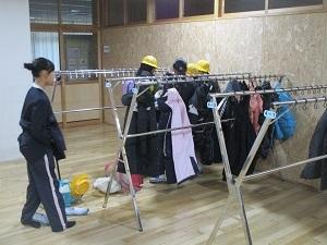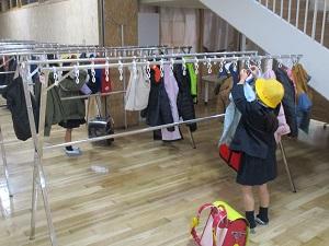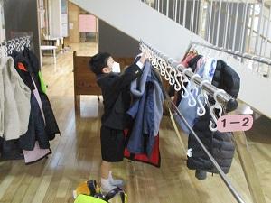 さて、子供たちのジャンパーを掛ける場所が傘置き場の上にあり、低学年にとってはとても掛けづらく、また長いジャンパーは傘と重なってしまうというとても不便な面がありました。濡れていなければランドセルの中に入れることもできましたが、雪が降って濡れてしまうと置き場に困ってしまいます。そこで、布団干しを少し改良して、コート掛けを作成し、玄関奥に冬の間だけ設置することにしました。コートが必要なくなれば、たたんで片付けることもできるしとても便利です。玄関の混雑も解消し、背の小さい子もフックにかけることができます。皆さん、帰りには乾いたジャンパーを着て帰れますよ。もう雪遊びをしても大丈夫です。元気に冬を乗り越えてくださいね。