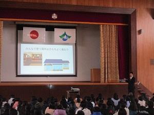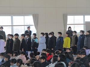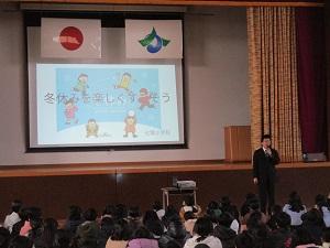 校長先生からは2学期を振り返って、自分が「向上」したと思うことを大切にし、3学期はそのことをさらに「充実」させて、次のステップを目指すための準備の学期にしてほしいというお話がありました。また、生徒指導担当の先生からは、冬休みに大切にしてほしいこととして、「ふゆやすみ」の頭文字で5つ大切なことを確認しました。