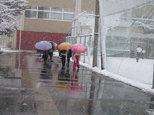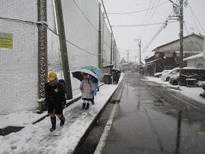 22日、いよいよ冬将軍がやってきました。大人は雪と聞くと困ってしまいますが、子供達は雪が降るとなんだか嬉しいようです。しかしながら、雪や雨の日はどうしても車での送迎が多く、駐車場の出入口がとても危ないです。また、校門前には信号のない横断歩道もあります。こんな雪の朝でも、ボランティアさんのおかげで、子供達は安心して登校できます。本当にありがとうございます。
