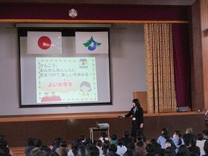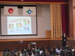 校長先生からは2学期を振り返って、自分が「向上」したと思うことを大切にし、3学期はそのことをさらに「充実」させて、次のステップを目指すための準備の学期にしてほしいというお話がありました。また、生徒指導担当の先生からは、冬休みに大切にしてほしいこととして、「ふゆやすみ」の頭文字で5つ大切なことを確認しました。