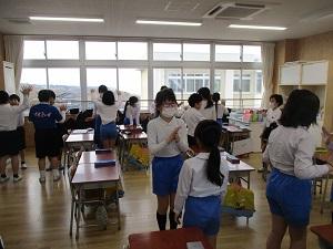 多目的ルームを見ると、図書室がぐっと春らしく模様替えしました。またその奥の調理室からは甘い香りがしてきます。見ると、6年生が炊飯器でチョコレートケーキを作っていました。お家の方のために焼いて持って帰るのだそうです。6年生は卒業に向けて、感謝の心を行動で表しながら、真剣な卒業式練習も続けています。