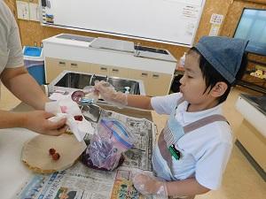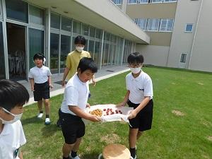 のぞみ・ひかり学級の子供たちは、6月から梅シロップと梅干しづくりに挑戦しています。先日のよいお天気の日には、梅干しの天日干しをしました。紫蘇で色付けしたウメを袋から出して一つ一つしっかりとクッキングペーパーで拭き、ざるにきれいに並べて、お日様に干す作業を頑張りました。