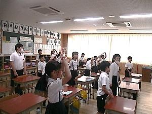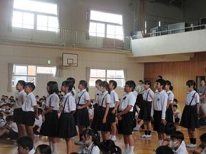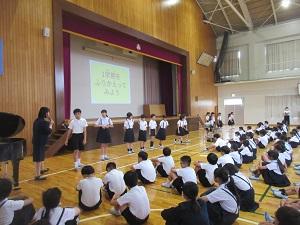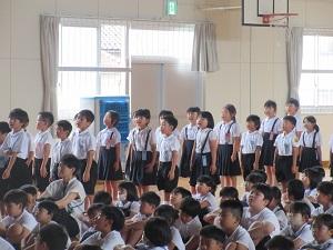 毎日とても暑い日が続いています。子供たちは、日傘や冷却タオルなどで工夫しながら、登校しています。学校には行ってしまえばエアコンがありますので、とても涼しく過ごせています。今朝も3年生が、今月の歌に手話を取り入れながら元気いっぱいの歌声を響かせていました。