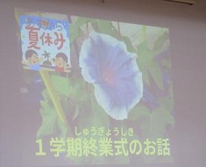 5限後、玄関で子供たちを見送っていると、晴れ晴れとした笑顔がとてもステキでした。これは、きっと子供たちが明日からの夏休みを本当に楽しみにしているのでしょう。終業式の中でも、「宿題をがんばりたい」「科学研究をしたい」「旅行が楽しみ」など、嬉しい声も聞かれました。私たちまで嬉しくなりました。