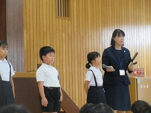 今日は4限目に終業式がありました。校長先生のお話の中で、1学期に頑張ったことを学級の代表の皆さんが発表してくれました。また、今月の詩は、1年生・5年生が発表してくれました。1年生は元気いっぱい、5年生はとても流暢で、それぞれの良さがしっかりと表現されていました。校長先生からは、安全安心な夏休みをぜひ送ってほしいこと、生徒指導の先生からは、6年生が国語科で書いた提案書をもとに、SNSとどう付き合っていくかのお話がありました。最後に音楽クラブの演奏で、今月のうたを元気に歌って終業式を終えました。