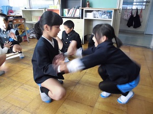 足を伸ばしてジャンケンです。足を上げて伸ばすことで腹筋も鍛えられます。朝から児童の元気な姿を見ることができました。
