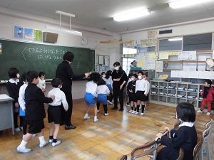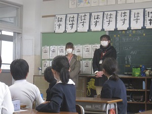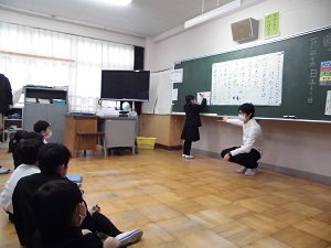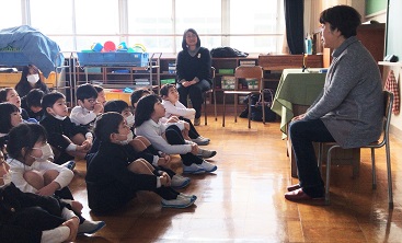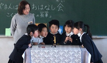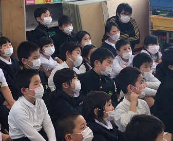 「のはらうた」の詩や「七草がゆ」の手遊び、国語教科書に掲載されている「三まいのおふだ」の読み聞かせをして頂きました。沖縄や津軽、はてまた外国(アイルランド)にも「三まいのおふだ」と似ている話があると聞き、児童たちは驚いていました。最後にそのアイルランドのお話「雄牛のブーコラ」の語りを楽しみました。「三まいのおふだ」はおふだが三枚出てきますが、「雄牛のブーコラ」は雄牛の毛を3本使います。いずれも我が身を助けてくれる働きをします。地域が違っても似たような話が伝わっているのはおもしろいですね。