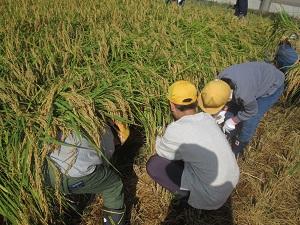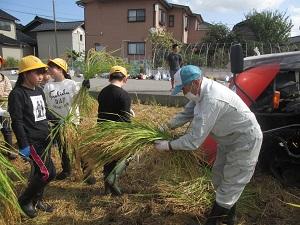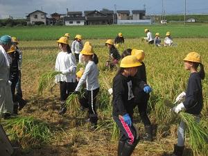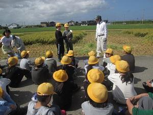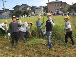 子供たちは、「バケツ稲の時は稲が硬かったけど、渡辺さんの田んぼの稲は柔らかくて刈りやすかった。」「ギコギコ切ると思っていたけど、まっすぐ切ればいいことが分かった。」と切ってみての感想や、「バケツ稲と比べて虫食いなどもないきれいな稲だったので渡辺さんの稲の育て方はすごいな。」という渡辺さんが大切に育ててくださった稲についての感想を持つことができました。