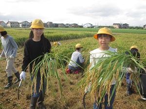 5年生は今日稲刈りに挑戦しました。5月に田植えをさせていただいた渡辺さんの田んぼに出かけ、自分たちが手で植えた苗を鎌で刈り取りました。最初は鎌の使い方もわからず、なかなか一気に稲を刈り取ることができなかったのですが、どんどん慣れてきて、「ザクッ」と一気に刈り取れるようになり、最後まで楽しく稲を刈り終えることができました。