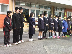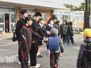 中学生が、ハイタッチ挨拶をしてくれて、寒くて凍えていた子ども達の顔にも、笑顔があふれました。