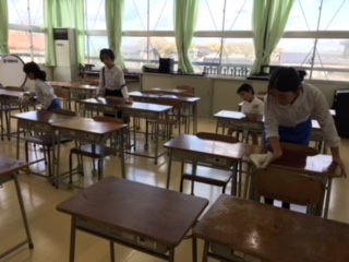 一方、来週から直ぐに授業ができるようにと、仮校舎の特別教室やトイレの掃除もしました。月曜日登校するのが楽しみですね。