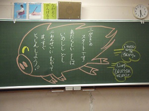 学校では、各担任が黒板にメッセージを書いて準備をしています。