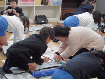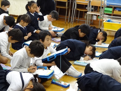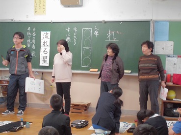 今日、明日と書道ボランティアに来ていただいて3~6年生が書き初めの練習をします。今朝は、5年生と4年生が教えていただきました。5年生は「流れる星」4年生は「進む勇気」です。