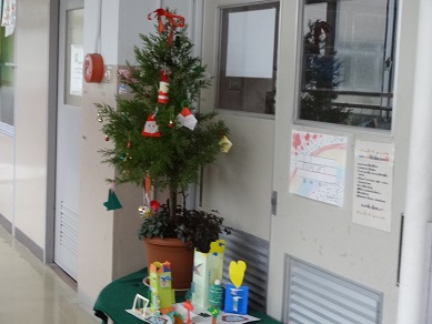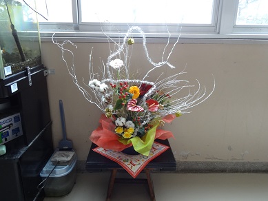 玄関前の廊下には、クリスマスバージョンの生け花が飾られています。