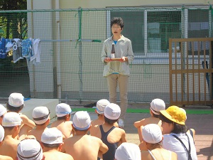 プール監視をする際には、1人で対応するのでなくチームで行うことが大切であることを教えていただき、参加者みんなで危機意識を高め合いました。学校でも、事故が起きないように、プールでの安全指導を行っていきます。