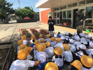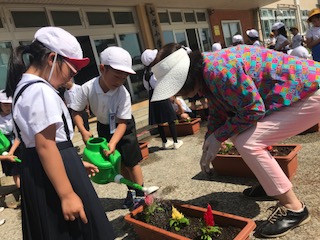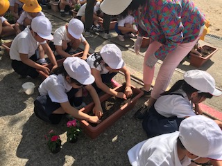 1年生がボランティアのお花の先生と一緒に玄関の花を植えました。