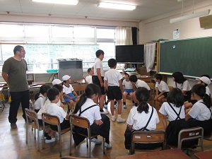学校の警備をしてくださっているALSOKの警備の方々をお迎えして、1年生が不審者から身を守る勉強をしました。