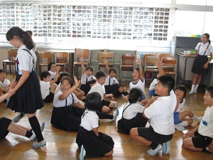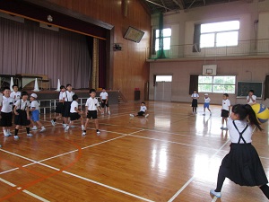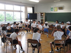あいにくの雨だったため、外では遊べませんでしたが、各グループごとに、6年生の考えた遊びを楽しそうに行っていました。