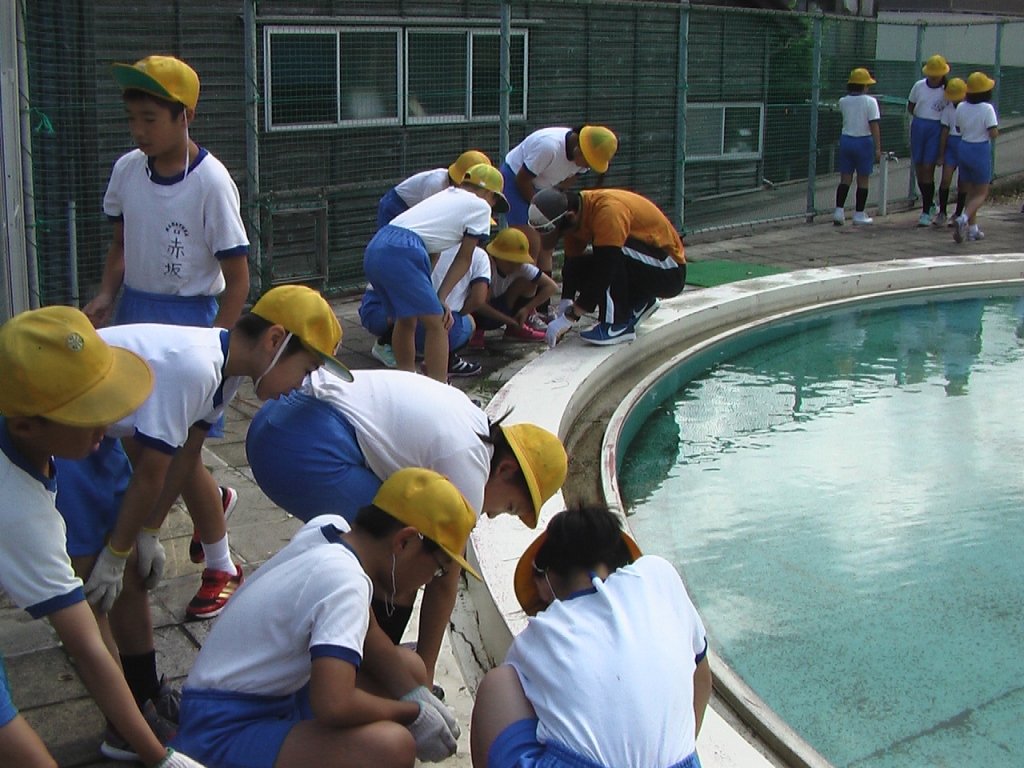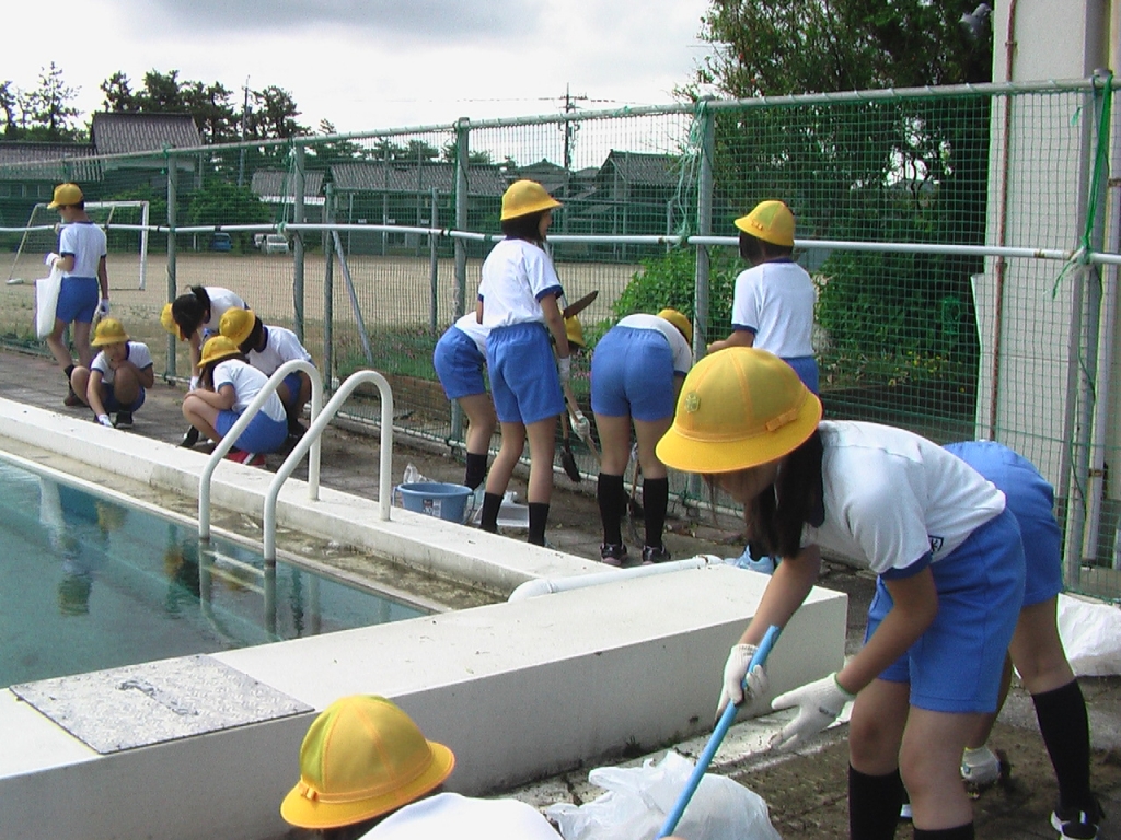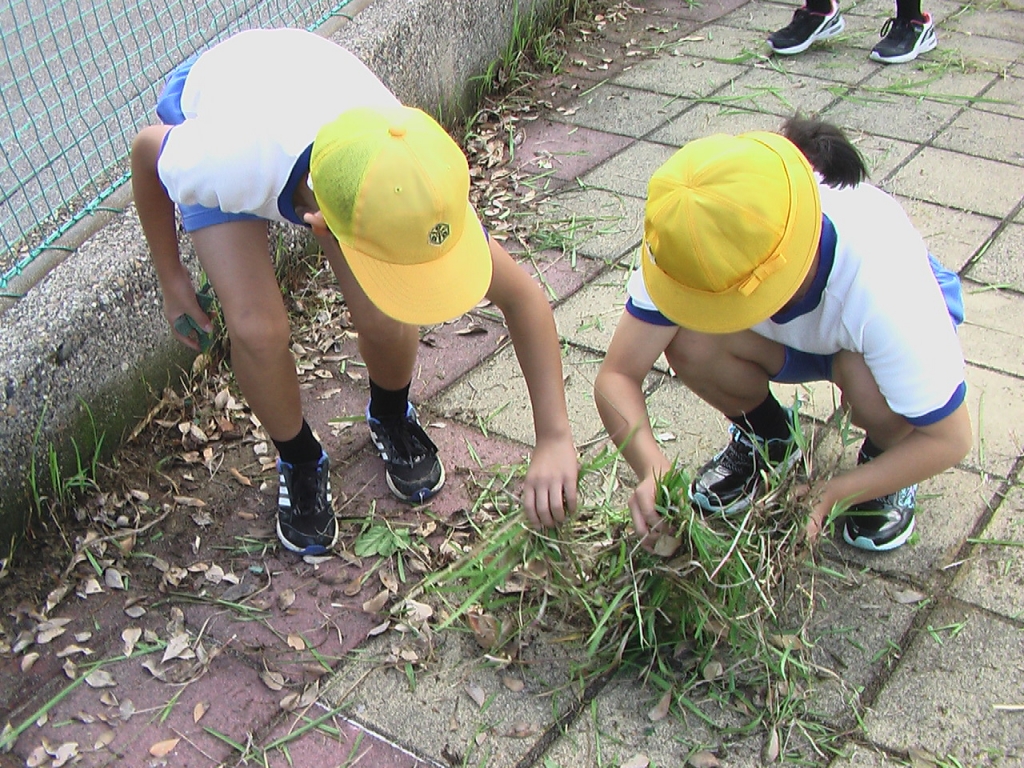 11日のプール開きに向け、5年生がプールサイドの除草を
