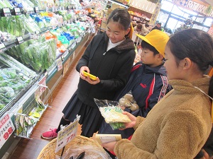グループごとに電卓を片手に持ち、調理実習の材料を選びました。どのグループも、新鮮かな?お金は足りるかな?と、品質や価格を考えながら購入していました。