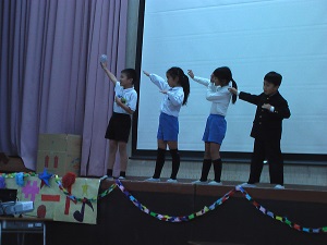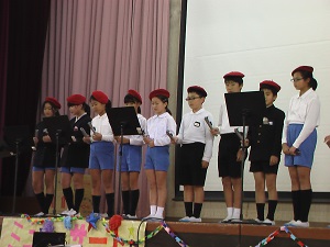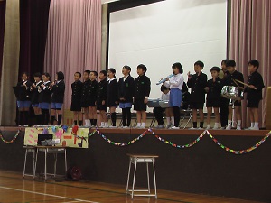 メロディークラブ「きよしこのよる」に始まり、5年生の「パイレーツ・オブ・カリビアン」の合奏、1年生のかわいい校歌の発表や2年生のU・S・Jダンス、3年生は有志7人での「ジングルベル」、4年生はそれぞれのクラス全員での合奏を聴かせてくれました。