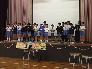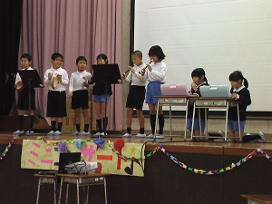 昼休みに体育館に集合して、全校児童で音楽発表を楽しみました。