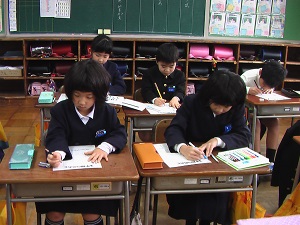 宮城道雄さん作曲の箏曲「春の海」をBGMに、校内書き初め大会を行いました。素敵な調べの中、心を落ち着かせて、どの子も真剣に筆を動かしていました。