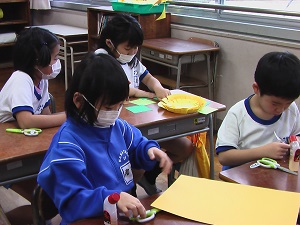 出し物以外の準備も、着々と進んでいます。今日は、1年教室で体育館の飾り図繰りをしていました。大きなひまわりの中には、わんぱくグループの1年生と6年生がなかよく写った写真が貼ってありました。きっと6年生も喜んでくれますね。
