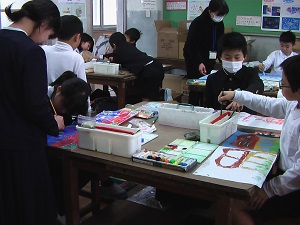 4年生が、初めて彫刻刀を使った木版画に挑戦しています。今日は、彫った版に色を付けて印刷していました。色を塗り、馬連でこすり、微妙な色合いを工夫しながら、真剣に作業していました。素敵な作品に仕上がるのを楽しみにしています。