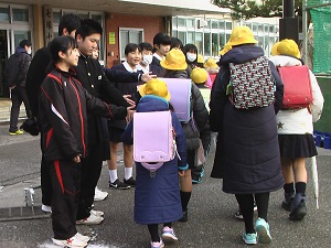 中学生が、ハイタッチ挨拶をしてくれて、寒くて凍えていた子ども達の顔にも、笑顔があふれました。