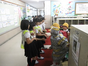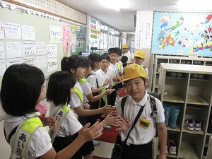 3年2組では話し合いをして、たくさんの人にハイタッチをしようという目標を立てました。ハイタッチしながらあいさつをするとみんながにっこり笑います。