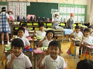 今日は、七夕。学校では、5日(金)に七夕献立の給食をみんなで食べました。星のハンバーグときらきらサラダに天の川汁、デザートは七夕ゼリーでした。