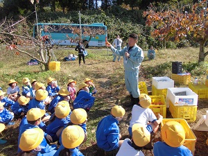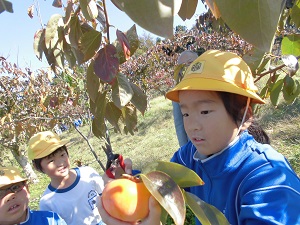 全員が柿の実を収穫でき、うれしそうにしていました。また、質問タイムでは、柿が1日にいくつ収穫されているか、年間でいくらお客さんに買われているかなど疑問に思ったことを質問できました。実物に触れ、とてもよい経験ができたようです。