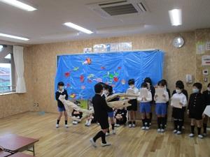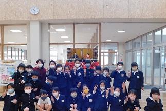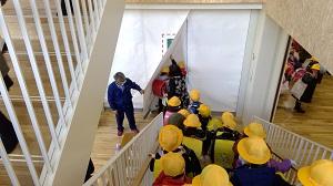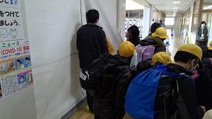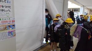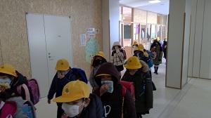 下校時間に避難訓練を行いました。今回は、防火布を実際におろし、防火布をくぐり抜けて避難することを確かめました。児童は放送を聞き、煙を吸い込まないように、静かに避難していました。
