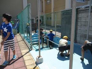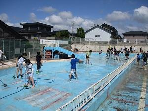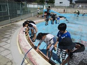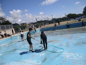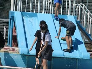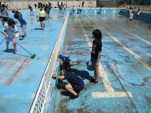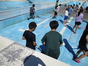 いよいよ水泳の季節がやってきました。そこで、5・6年生が今日プールの掃除をしてくれました。少し肌寒かったかもしれませんが、6年生はプールの中の壁やオーバーフローをとてもきれいに磨いてくれました。5年生は最初は回りに生えた草をきれいにむしり、その後、プール内の泥をブラシでこすってくれました。思ったよりも排水が進まず、最後は水が残ってしまいましたが、おかげでとてもきれいになりました。1日乾かして、明後日から注水していきます。プール開きは13日の予定です。夏がそこまで近づいている感じがして、とても楽しみですが、ルールを守り、体調をしっかり整え、安全に十分気を付けて、水泳の学習を行っていきましょう。保護者の皆様、ご理解ご協力をお願いします。