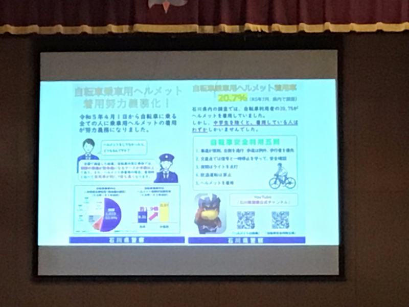 特にヘルメットの重要性については、事故の場面の映像や実際にヘルメットを装着して、あごひもを付けることなどポイントを指摘されました。自転車の主な交通違反として、信号無視や携帯電話使用等、その他無灯火や傘差し運転、二人乗りや制動装置不良自転車運転をしないように注意がありました。