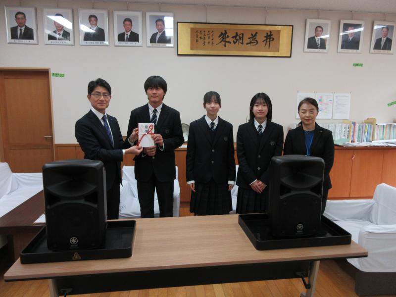 12月15日(月)、(公財)北陸電力教育振興財団様からのスピーカー3台寄贈に伴う「2025年度教育用備品贈呈式」が校長室で行われました。北陸電力教育振興財団からは常務理事の藤井様はじめ3名、本校からは大森校長、生徒会会長の関軒さん、副会長の野岸さん、竹田さんの4名が出席しました。藤井様より関軒生徒会会長に目録が贈られました。