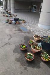 卒業式に卒業生を華やかにお祝いするため、2学期から草花や生物活用の授業でプランターへの寄せ植えを行ってきました。3学期からは残念ながら地震による休校などもあり実習を行うことができませんでしたが、何とか卒業式までにプランターを玄関前に設置することができました。今回設置したプランターにはパンジーやビオラを定植しました。配置バランスに気を付け、何度も修正を行ったり、台を置いて高さをつけるなどより目立たせるためにたくさんの工夫をしました。