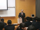 学校長による講師紹介に続いて、小西氏からは、自撮りプライベート写真のSNS上の危険性についてDVDを視聴して講話がありました。また本田氏からは、少年非行の中で特に問題であるいじめに特化して、いじめの4層構造の中の、見て見ぬふりをする「傍観者」となることの重大性について話がありました。両氏からは、地域の人が東雲高校の生徒を見守っている、困ったことがあれば大人に相談してほしい、そして安心、安全で楽しい高校生活を送ってほしいと締めくくり、非行防止教室が終わりました。