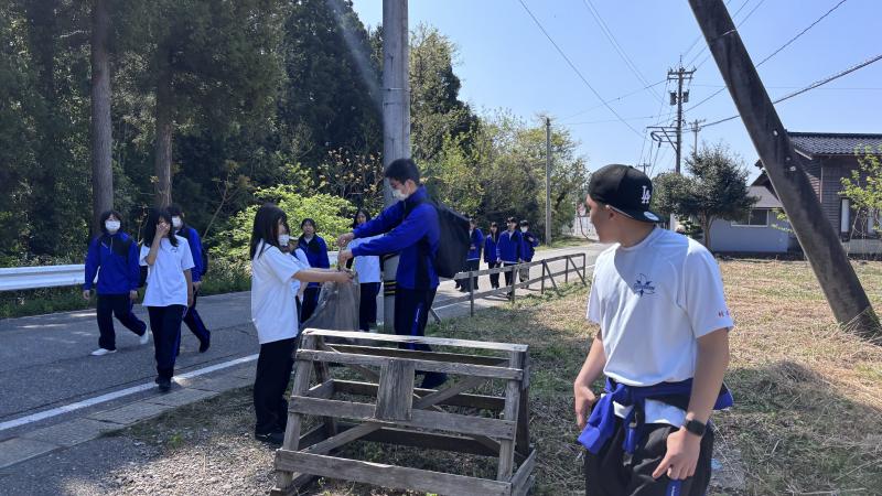 5月1日(木)1年生にとって初めての遠足行事として、学校周辺の清掃活動と七尾市内の街歩きを実施しました。春の心地よい陽気の中、生徒たちはクラスメートと交流を深めながら、ゴミ拾いや地域の美化活動に積極的に取り組みました。