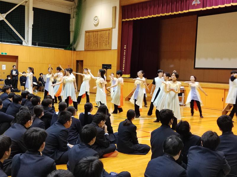 生徒たちは2日間を通して、『旅立ち』をテーマに様々な場面や感情を考え、それらを表現する演技を自分たちで創り上げました。最終日は、生徒たちの想像力やこれまでに培ってきた表現力が存分に発揮された素晴らしい発表になり、観覧した1年生や先生方も涙を流していました。