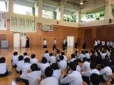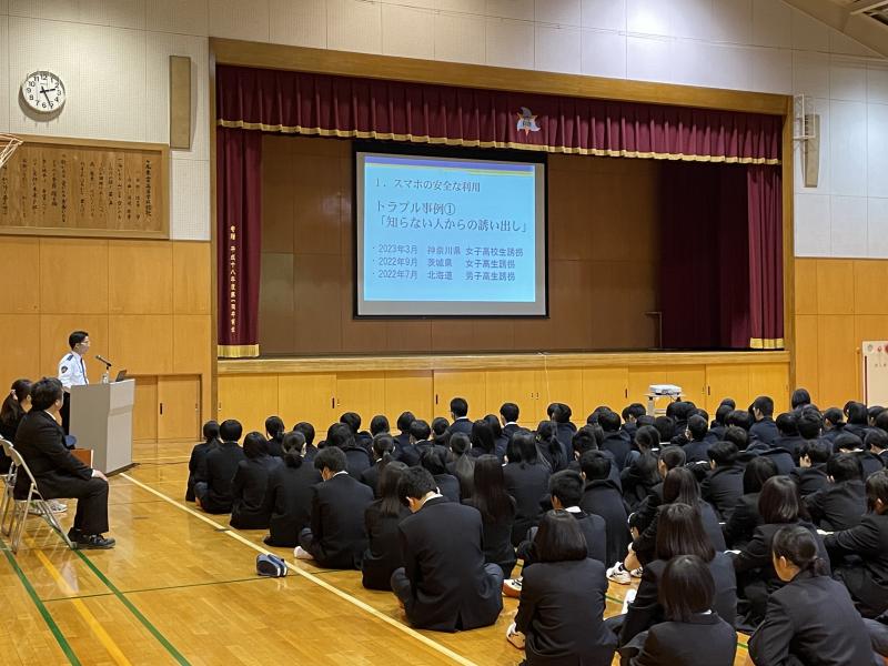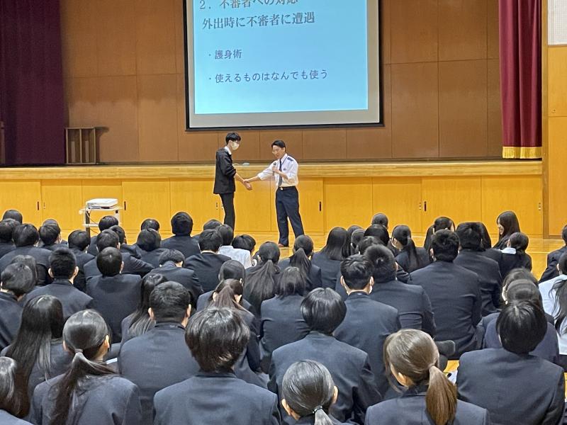 スマートフォンの安全な利用の仕方と、不審者対応の2点を主な内容としてお話しいただき、不審者対応の場面では、護身術として実際に不審者に手をつかまれるなどした場合の対処方法を、実演を交えながら教えていただきました。また、最後の質疑応答の場面では、生徒から活発に質問があがり、ひとつひとつに丁寧に答えていただき、よりよい学びの場となりました。