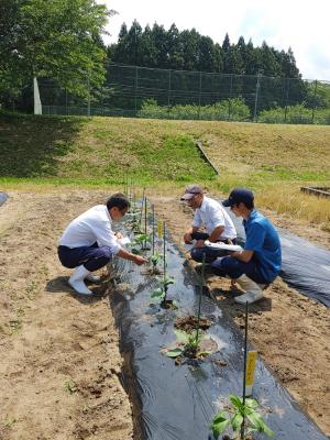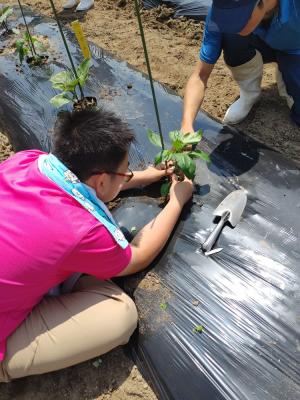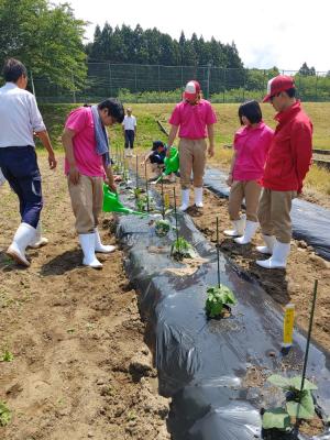 生徒は播種から手がけた苗(オクラと茄子)を定植します。
