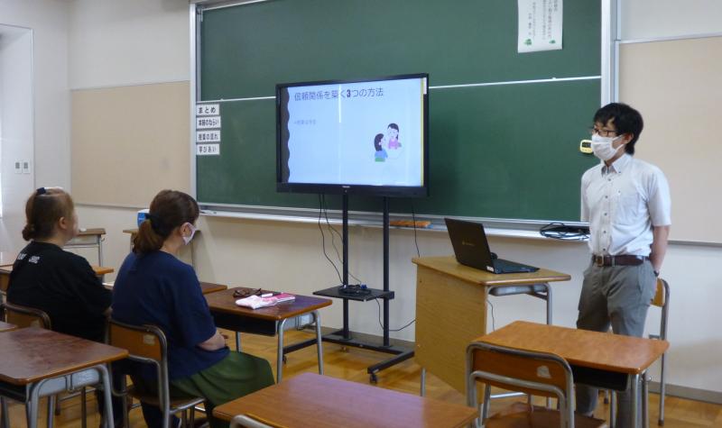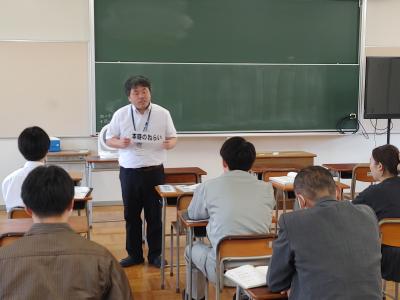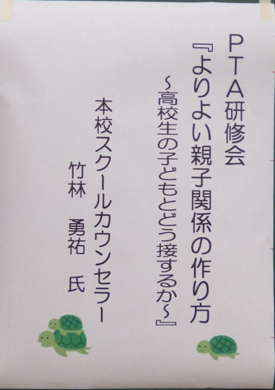 7月18日(木)14時~15時、1学期保護者懇談会に合わせてPTA研修会を開催しました。講師は本校スクールカウンセラーの竹林勇祐先生で、「よりよい親子関係の作り方~高校生の子どもとどう接するか~」というテーマでお話と、ペアでのロールプレイングを実施しました。PTAより11名の方が参加し、思春期の特徴や反抗期の対応、子どもとの信頼関係のつくり方など、分かりやすくお話をしていただきました。ペアワークでは、親役と高校生の子ども役になってテーマを決めて話し合いました。