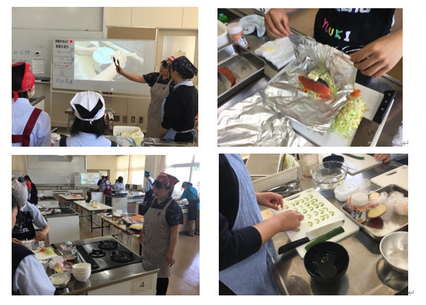 シャケの包み焼きを調理するとともに、キュウリの半月切りの練習も行いました。