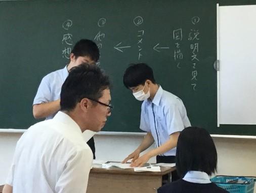 「国語表現」では、図の形や配置を、言葉で表現して説明する課題に取り組みました。グループで意見交換をするなど、より良い問題解決に向けて、協働して取り組みました。