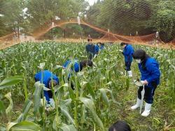 収穫では、①絹糸の色が黒っぽく変色してきているもの②触ってみて先の方まで実が充実しているもの③アワノメイガの幼虫に食害されていないもの、という3点に注意します。小雨の中でしたが、「どれがいいか」とトウモロコシを選ぶ生徒の目は真剣で、よいトウモロコシを選択するのも学習です。