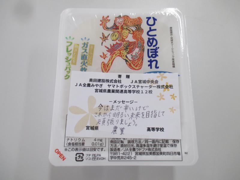 宮城県農業高校より手書きメッセージ入りのパックご飯をいただきました。